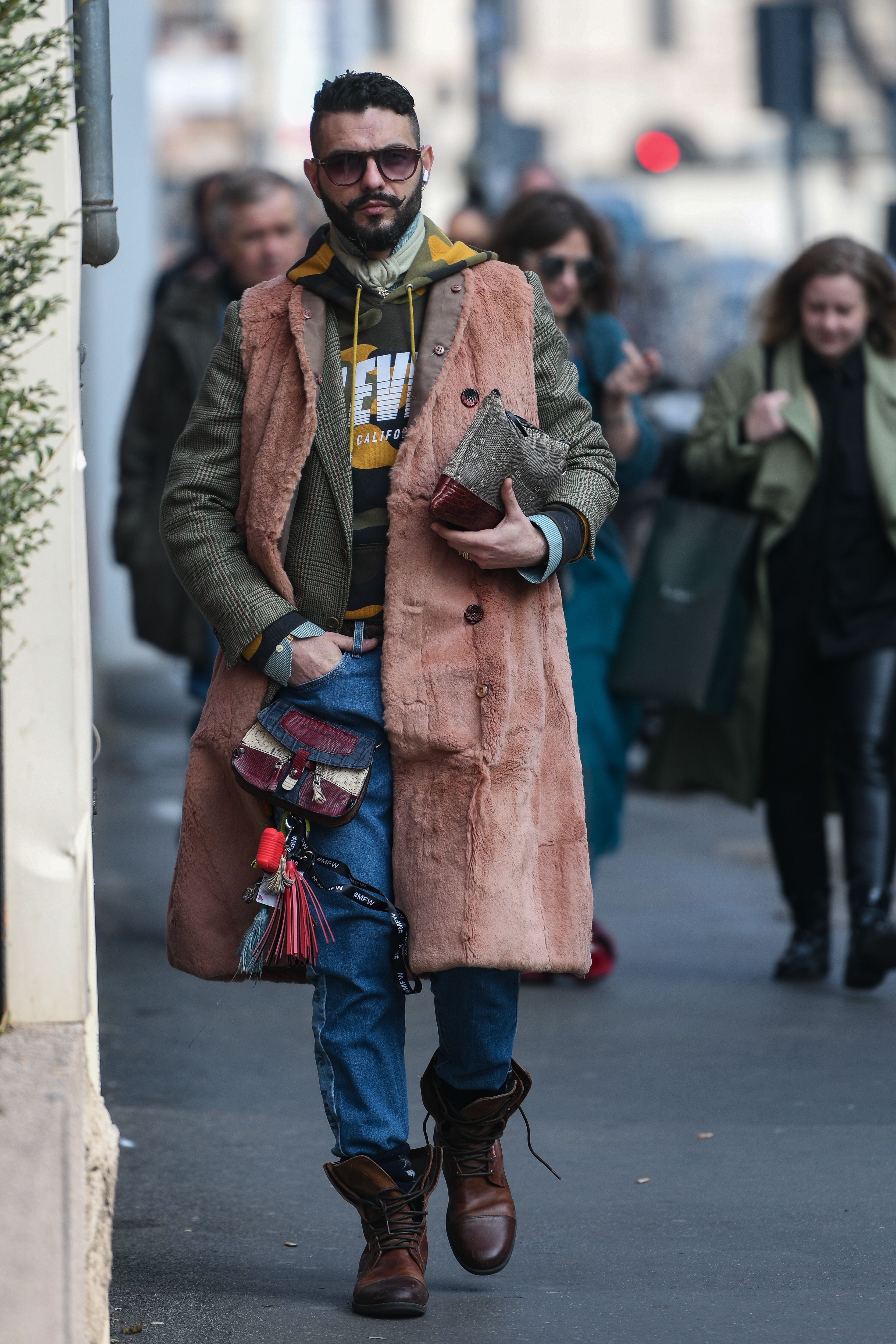 A guest wears a long fur vest outside Milan Fashion Week 2019.