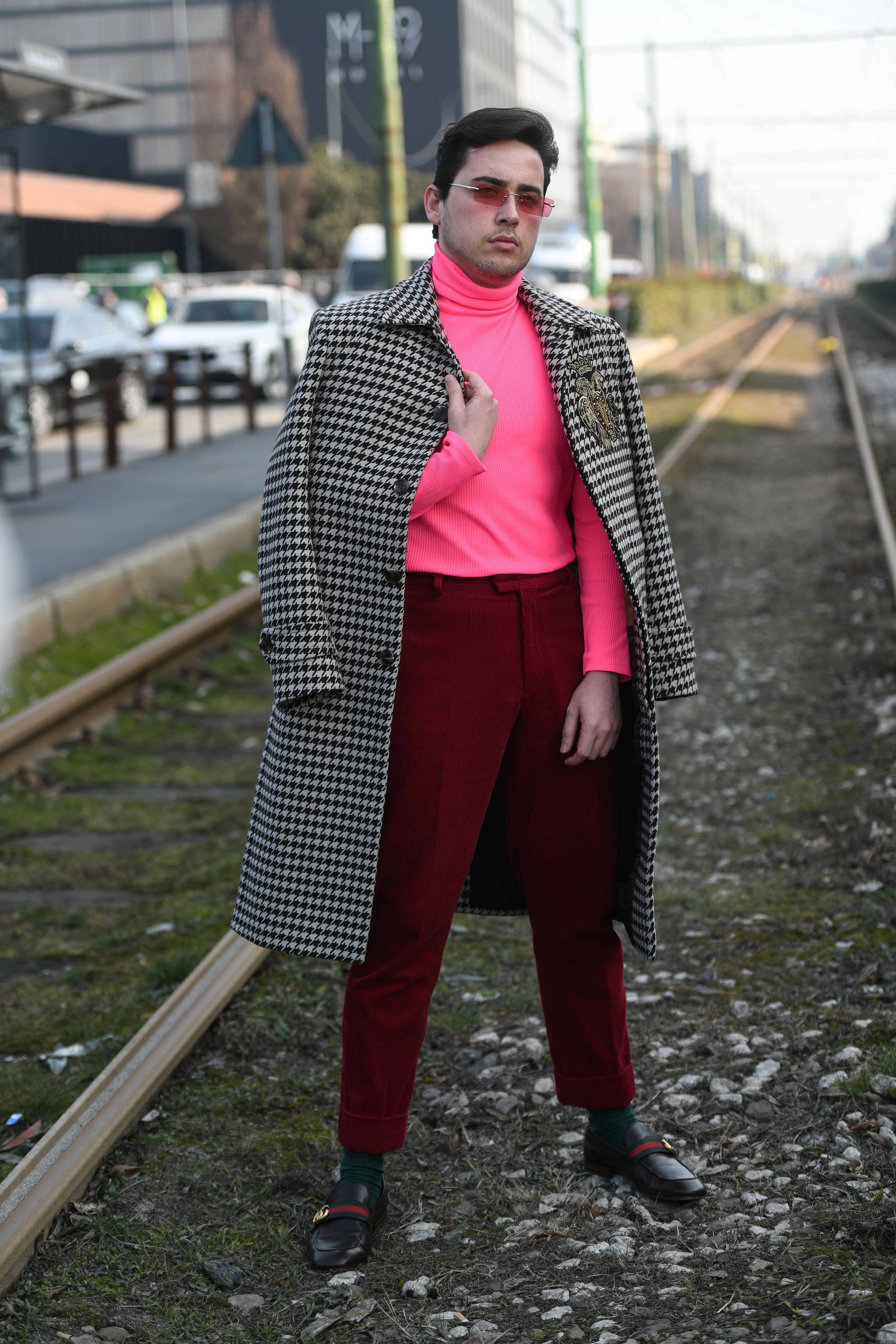 A guest attends Milan Fashion Week in a hot pink turtleneck, deep red pants, gingham blazer and Gucci loafers.