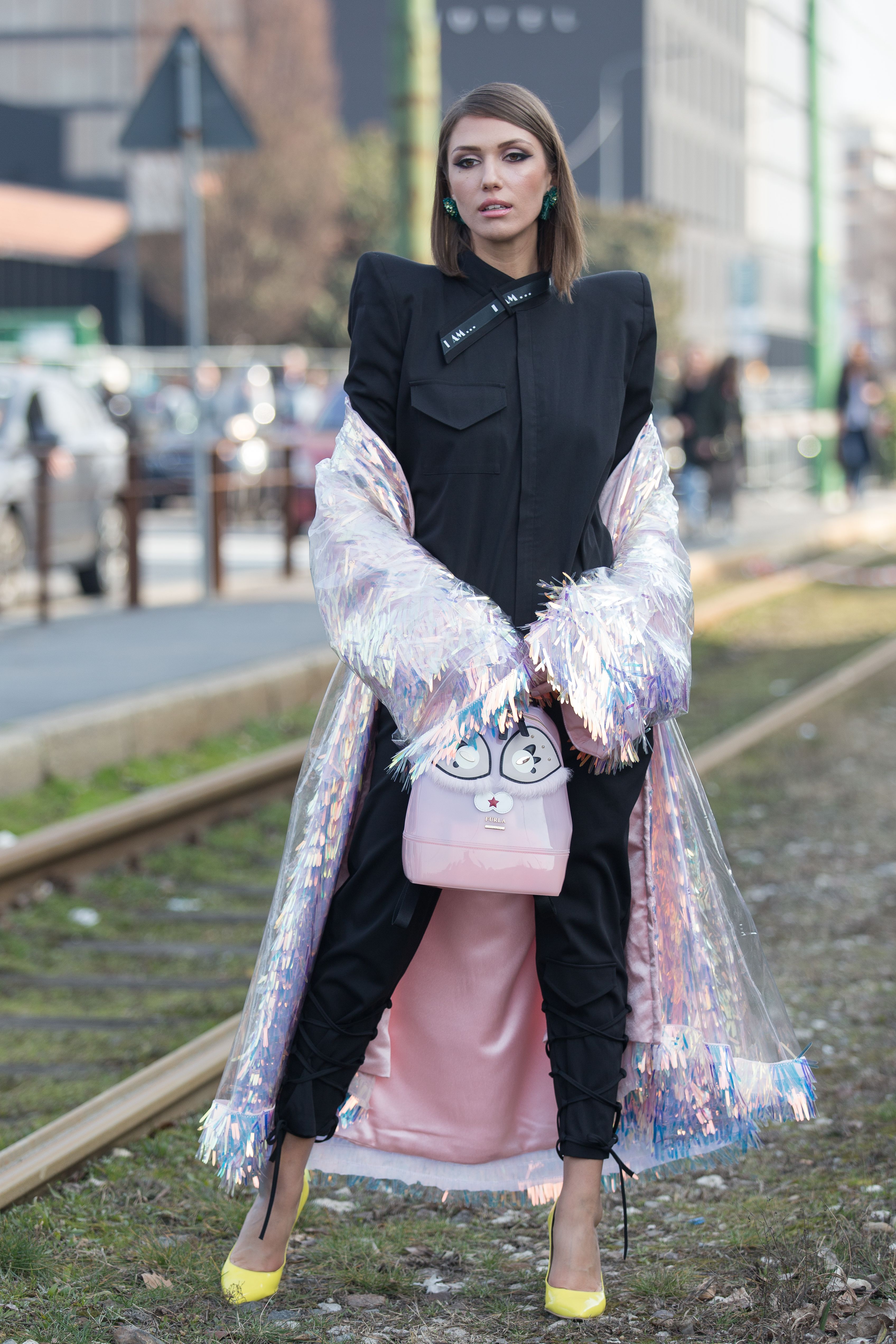 Landiana Cerciu wears a black jumpsuit, yellow heels and a glittery metallic coat during Milan Fashion Week.