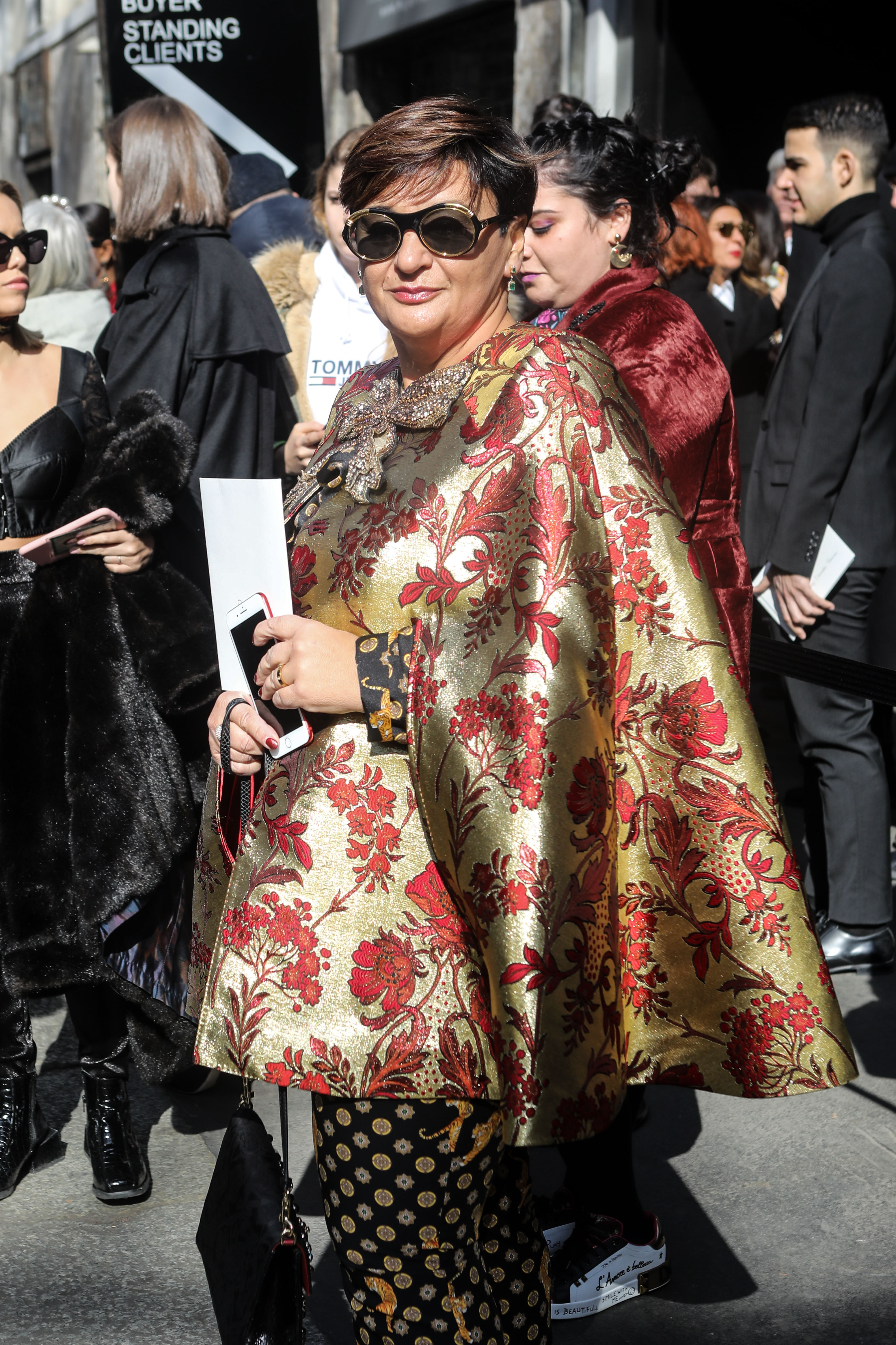 A guest sports a gold and red cape jacket outside Milan Fashion Week 2019.