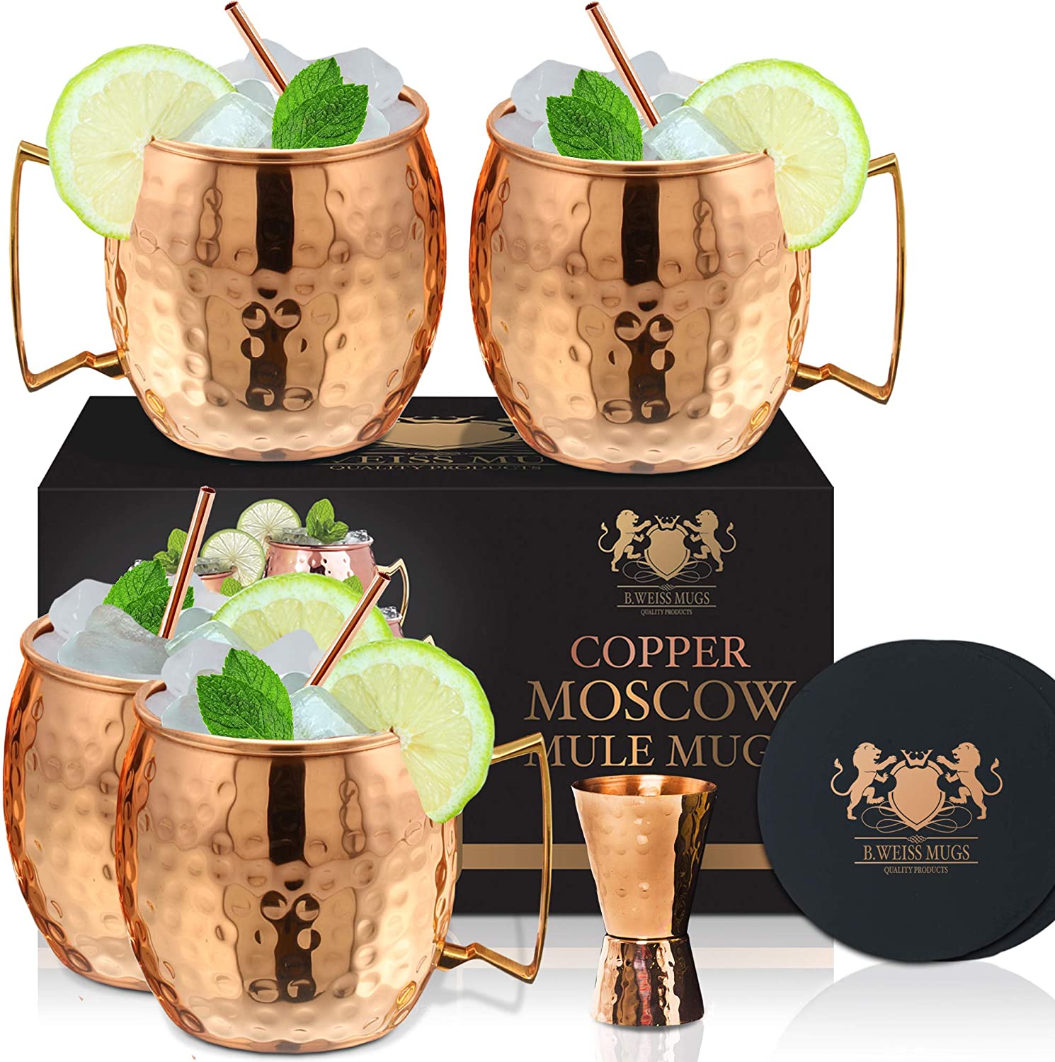 Featuring four 100 percent copper and handmade hammered Moscow mule mugs, this gift set also comes with several bonus items: four copper straws, four coasters, and one matching shot glass. These high-quality mugs are designed to resist tarnishing and fading so you can feel confident about your investment.