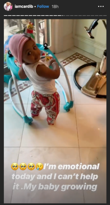 In her Instagram Stories, Cardi posted a video of little Kulture standing on her own. She said, “I’m emotional today and I can’t help it. My baby growing.”