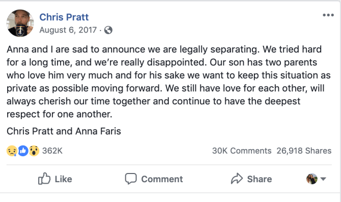 Prior to his engagement with Schwarzenegger, Pratt was married to Faris for nine years. The couple split up August of 2016 and fans were truly devestated. This time, Twitter and Facebook were the selected social media platform for this announcement. Both posted statements saying that they will forever love and respect one another and always make sure Jack, their 6-year-old son, was kept out of it.