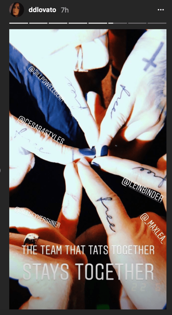 However, Lovato wasn’t alone in the inking process. She shared another photo showing her entire team with the same tattoo on their fingers. She wrote, “The team that tats together stays together.”
