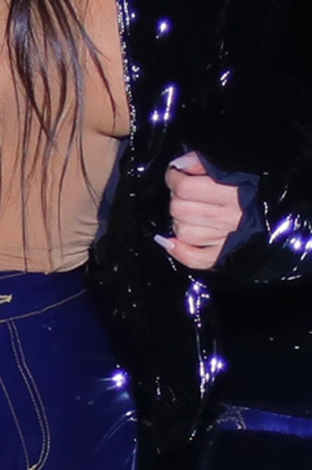 Although Tuesday night’s outing was her first since submitting her court papers, the SKIMS founder was also noticeably missing her wedding ring on the eve of her divorce filing. She was spotted leaving a friend’s house at the time, and in the photo above, it’s clear that the reality star was no longer wearing her wedding band or engagement ring on her left hand. The beauty mogul, however, still looked chic in a cropped black puffer jacket, a nude top, and blue vinyl pants, and bright white boots.