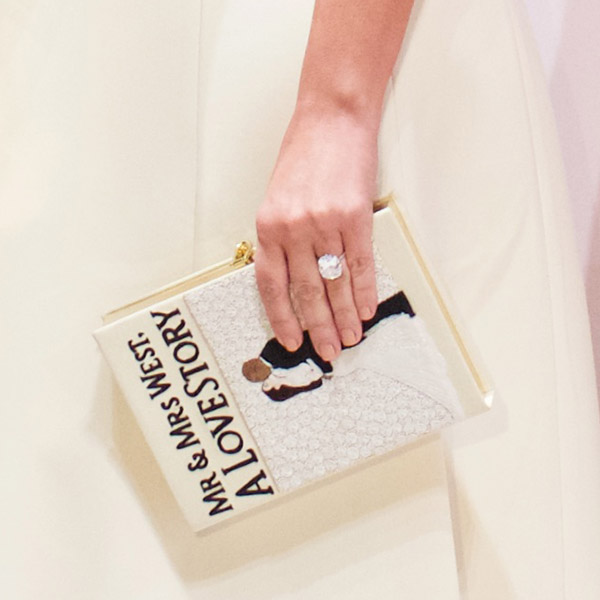 The bag was created by designer Olympia Le-Tan, who is best known for her box clutches inspired by famous literature from “Moby Dick” to “Brideshead Revisited” and which retail for $1,880. Le-Tan told People: “This bag was custom ordered by a close friend of Kim and Kanye, as a wedding gift. I was excited to see her carrying it.”