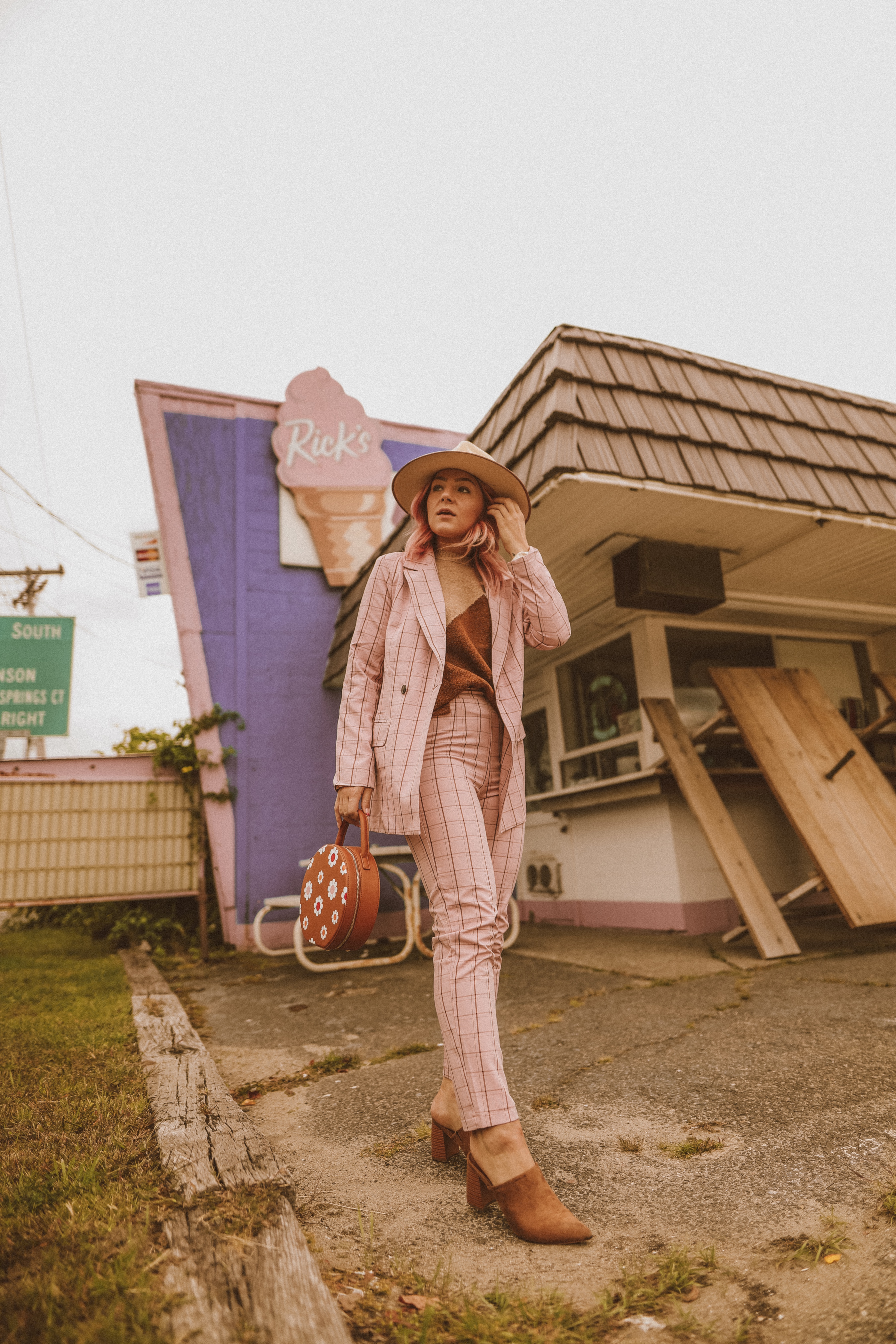 Trousers: Missguided | Blazer: Missguided | Sweater: Marks & Spencer | Hat: Lack of Color | Shoes: writer’s own | Purse: Valfre
