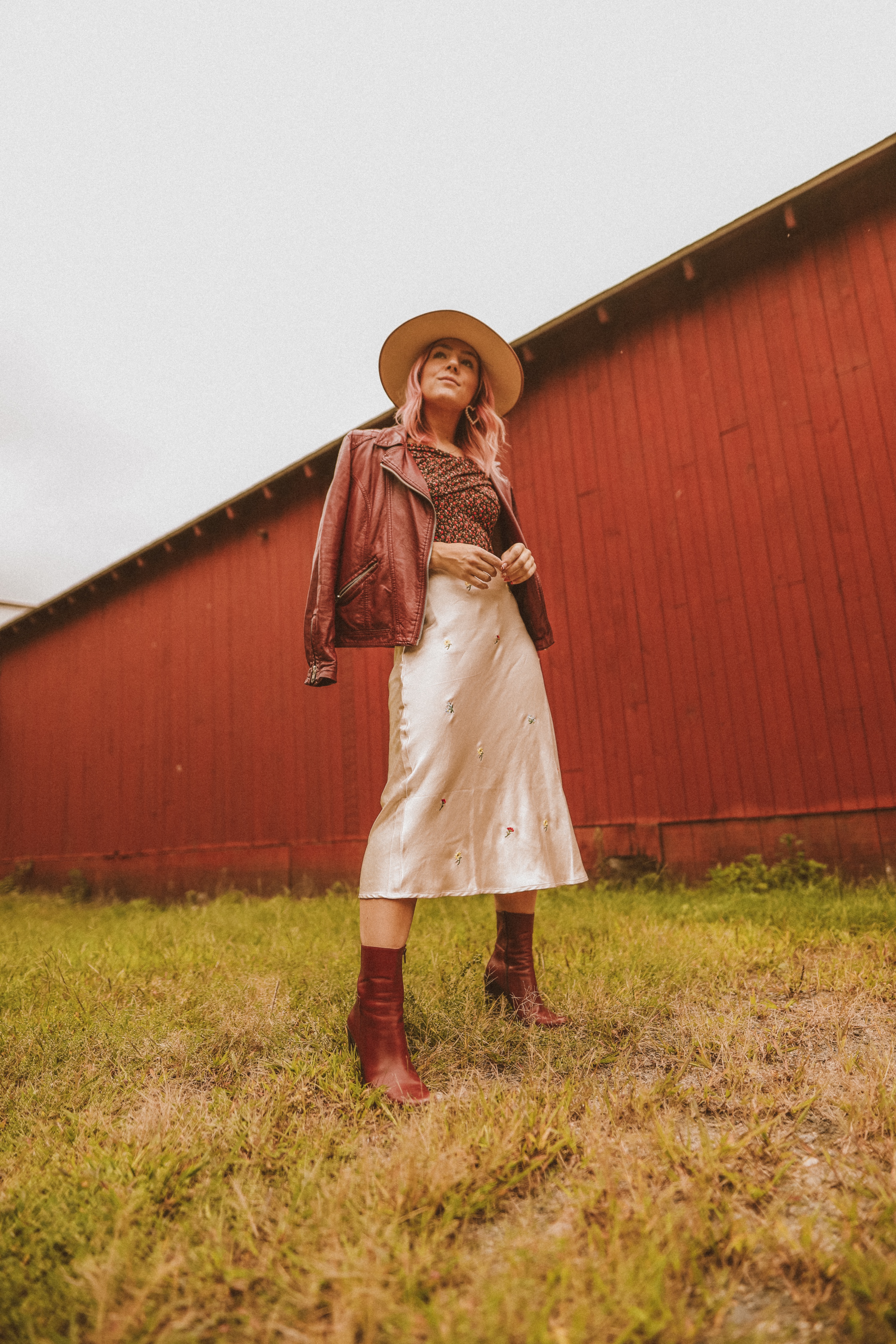 Skirt: Lulus | Bodysuit: Lulus | Shoes: thrifted, writer’s own | Hat: Lack of Color | Jacket: writer’s own