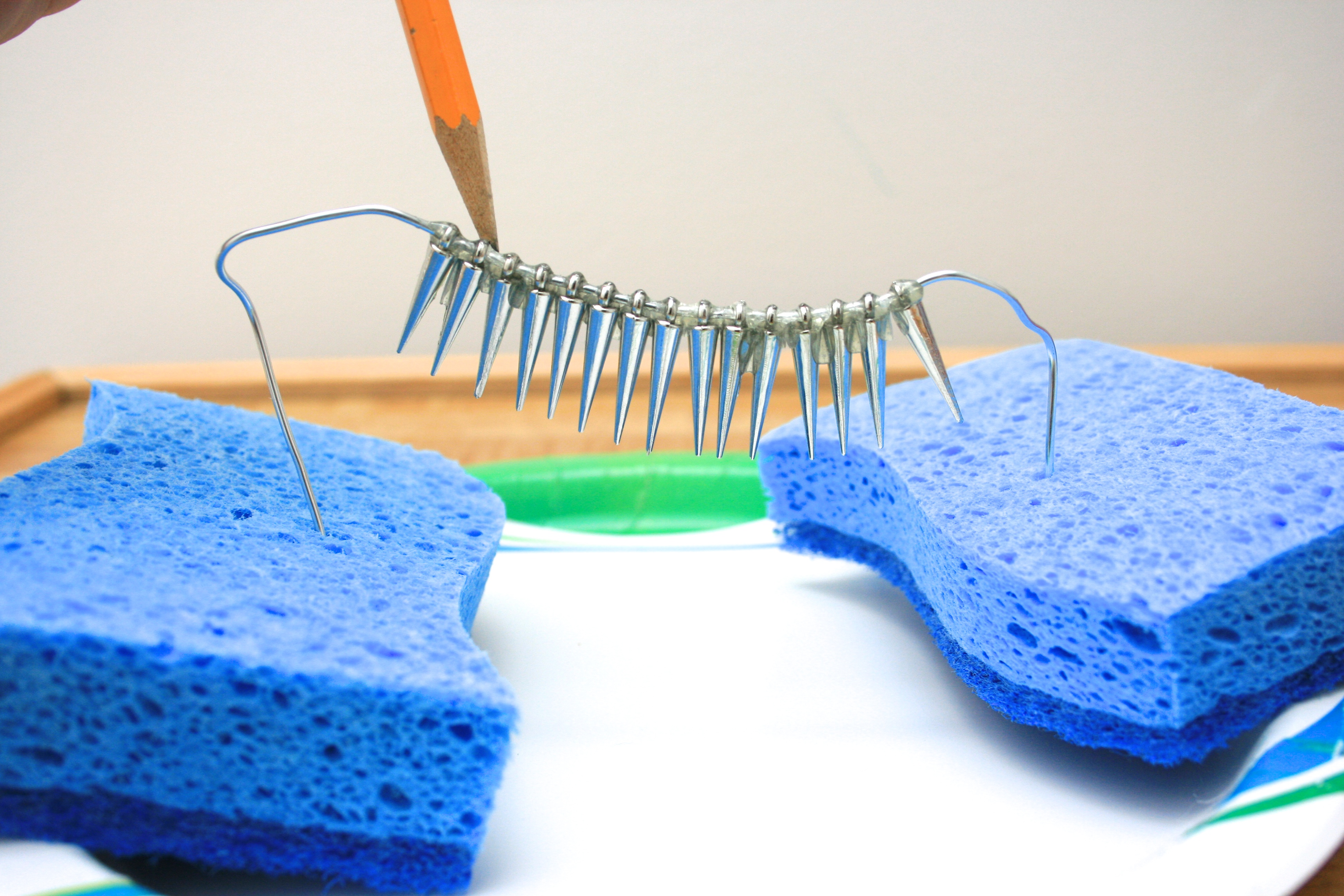 Step 3: Place the two sponges on the paper plate and “poke” each end of the wire into each sponge to anchor them, allowing the spikes to hang upside-down.