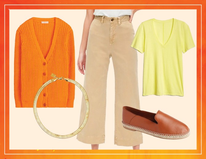 Shop the look: High Rise Wide-Leg Crop Chinos in Khaki, $59.95 at Gap; Oversized Cardigan in Tory Orange, $495 at Tory Burch; Soft Slub Dee V-Neck T-Shirt in Yellow, $24.95 at Gap; Harper Necklace, $84 at Miranda Frye; Leather Loafer Espadrille with Collapsible Back in Cognac Brown, $49.95 at Gap.