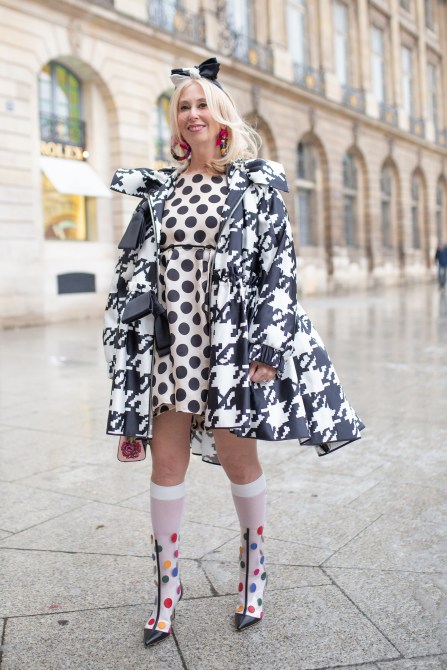 A guest is seen on the street attending Alexis Mabille wearing rainbow polka dot shoes, a houndstooth cloak, polka dot dress and hair bow.