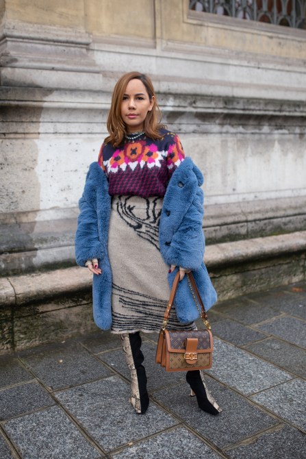 Fashion Consultant Jixxy Kamchoo is seen on the street attending Célia Kritharioti during Paris Couture Fashion Week wearing a blue fur coat, floral knit sweater and carrying a Louis Vuitton bag.