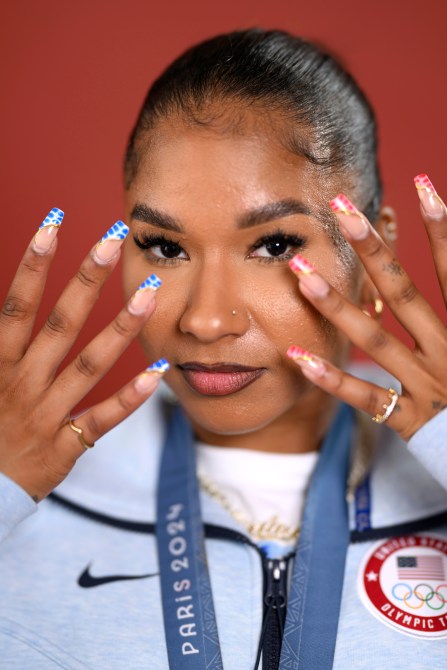 Jordan Chiles also served up #bignailenergy. When she won a bronze medal for her women’s gymnastics floor routine on August 5, Chiles flaunted a squared manicure with pink and blue patterned french tips that curved slightly towards the fold of her nail.
