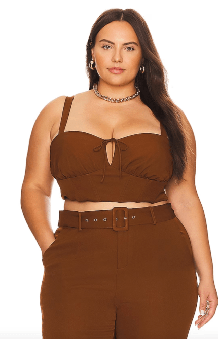 This brown crop top is perfect for a night out. Pairing it with gold jewelry (as seen in the photo) is an easy way to add a little personality to the look. It’s available in sizes XL-4X and it’s on sale.