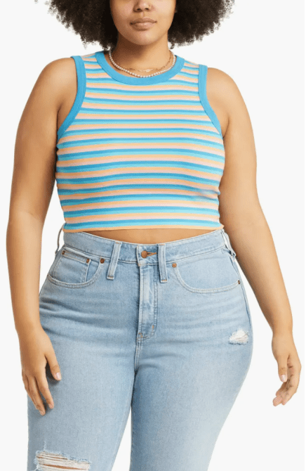 The spaghetti straps on this black tank from Madewell give the top a cute ’90s vibe. This is the kind of tank top you can wear with anything. I love that it’s cropped to the perfect length to wear with high-waisted pants. It’s available in sizes XL-4X.
