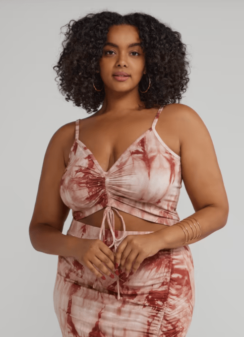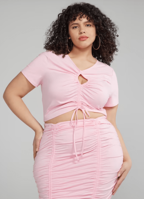 How sweet is this ballerina pink ruched crop top? The center is adjustable so you can determine just how cropped you want it to be. It’s available in plus sizes 0-4 and is currently on sale.
