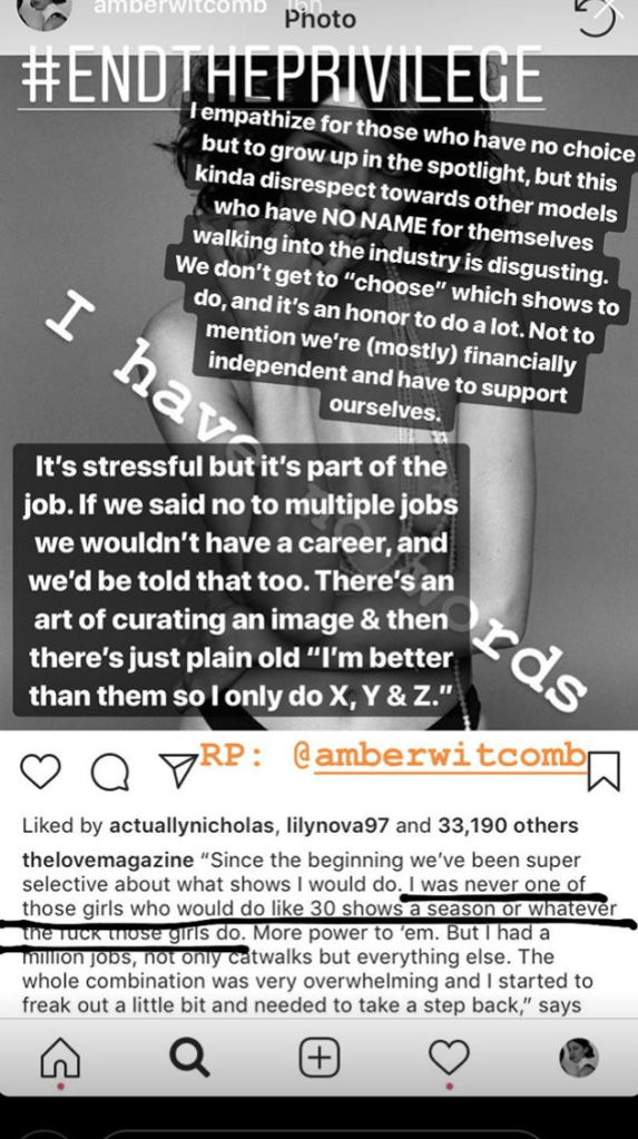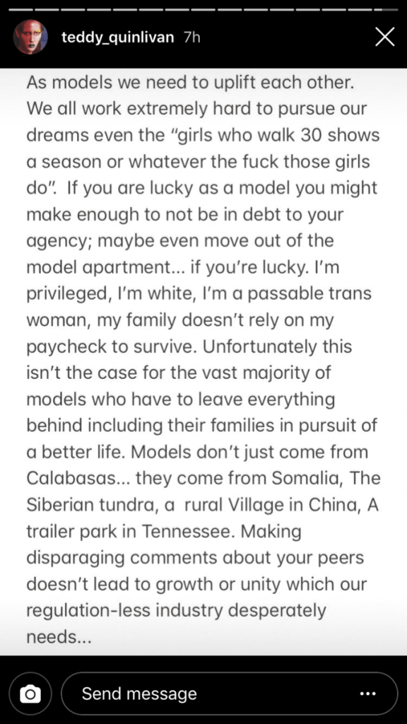 Another model added, “‘Those girls’ make expanentially [sic] less for the same job as you…Don’t come from a celebrity family…Weren’t born into privilege like you.”