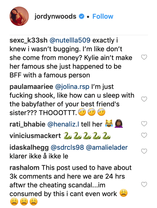 As for what fans think of the Woods-Thompson scandal, many suspect it could be publicity stunt. One Instagram user wrote, “people are really falling for this stunt? 🤦🏾♀️🤦🏾♀️ they still follow each other and kylie posted a snap of them together a while ago. They probably paid her to do this and y’all are falling for it smh” That’s a fair assumption, considering that Woods and the Kardashian-Jenners, including her best friend Kylie Jenner, still follow each other on Instagram.