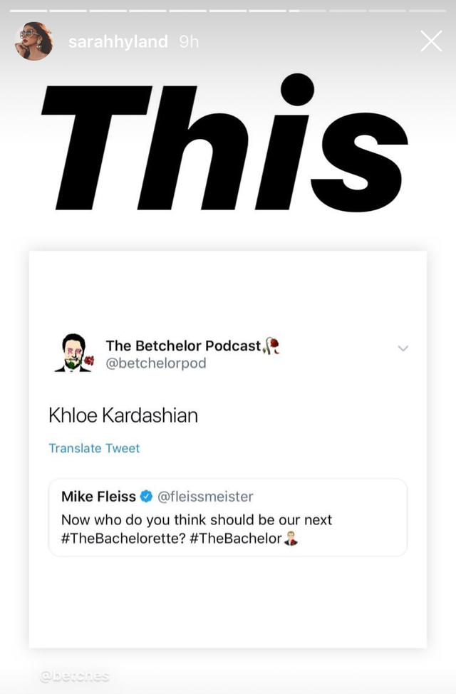 So, it seems Kardashian’s name is still in the ring for the next Bachelorette. And other celebs are all about it. Sarah Hyland was freaking out on her Instagram story. “This,” she wrote after seeing The Betchelor’s Tweet.