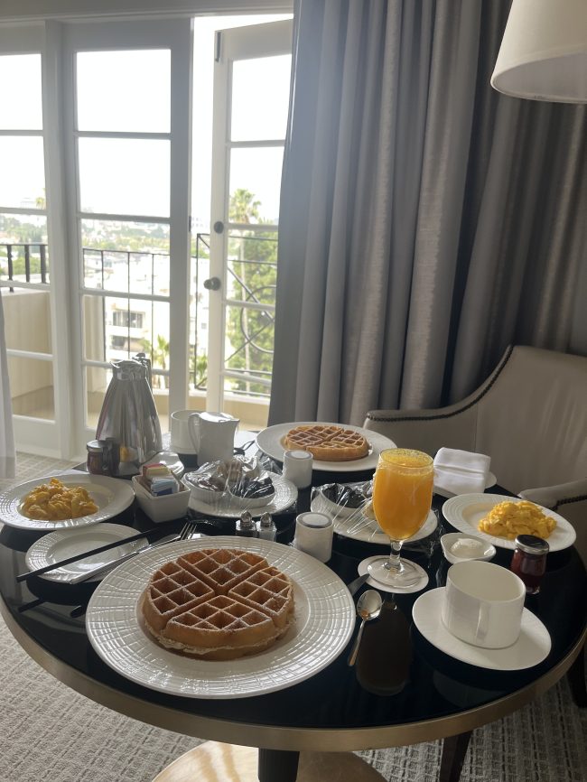 The next morning, we ordered breakfast from the hotel and watched our room transform into the most elegant dining area. What’s better than enjoying a glorious view of Beverly Hills while sipping coffee in a robe and eating waffles with expertly cooked eggs? After checking out, we passed by a very attractive team of professional soccer players in the lobby (truly a cherry on top), and within fifteen minutes, I was back in my apartment feeling refreshed, inspired, and resplendent with luxurious nourishment.